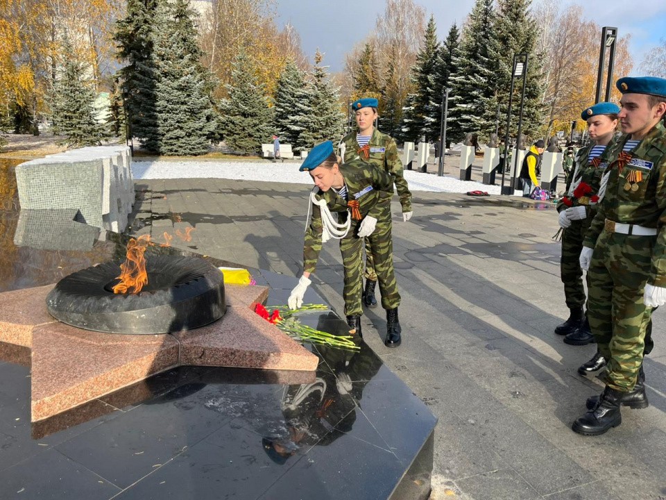 В начале праздника студенты филиала в составе взвода возложили цветы к Вечному огню.